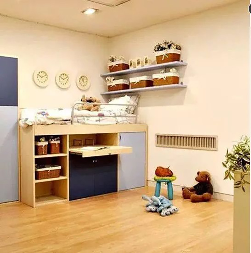 如果墙壁选择与木地板颜色同为浅色系,使得墙壁和地板的颜色比较接近,这样空间会显得大一点。